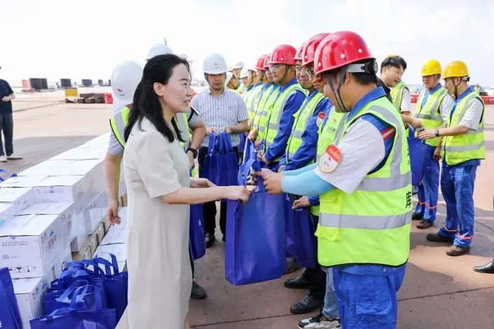 活動現場,袁欣與大家親切交談,詳細詢問一線職工的工作狀態和實際需求,對他們頂烈日、戰酷暑,始終堅守崗位的敬業精神表示衷心感謝,叮囑他們要注意防暑降溫,做好個人防護,并將防暑降溫“清涼禮包”送到職工代表手上。她說,當前高溫、惡劣天氣逐漸增多,各單位要切實做好夏季防暑降溫工作,動態調整作業時間,為廣大員工提供清涼舒心的休息場所,全面保障人身安全。同時,要時刻繃緊安全這根弦,聚焦生產、消防重點領域,常態化開展安全隱患排查治理工作,做好值班值守和應急處置,確保港區安全生產形勢穩定。