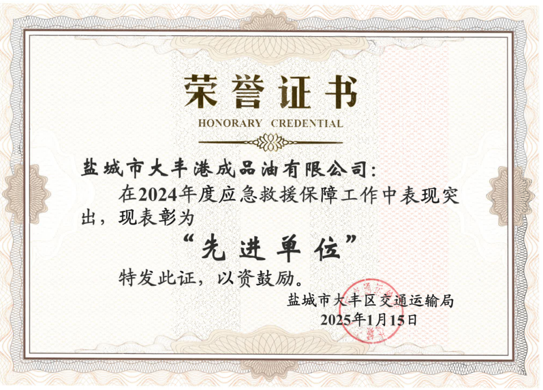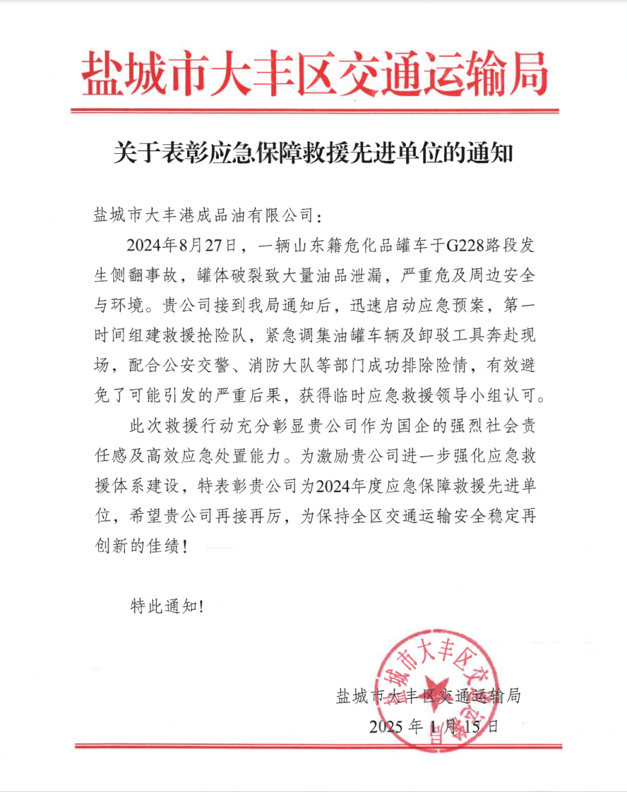 近日,鹽城市大豐區(qū)交通運(yùn)輸局將一份“2024年度應(yīng)急保障救援先進(jìn)單位”榮譽(yù)證書頒發(fā)給成品油公司,以表彰該公司在2024年8月的一次應(yīng)急救援行動中,展現(xiàn)的卓越的應(yīng)急響應(yīng)能力和高度的社會責(zé)任感。