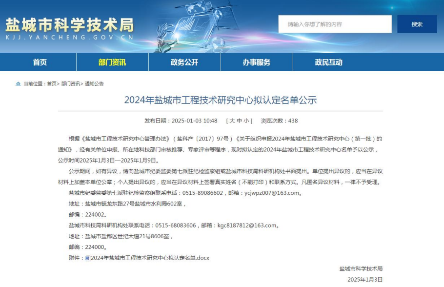 喜報!科技集團榮獲2024年鹽城市工程技術研究中心認定