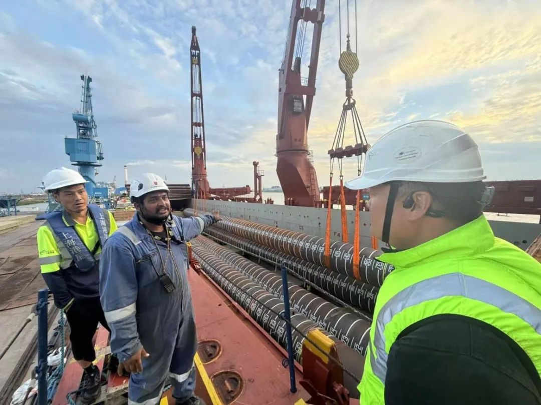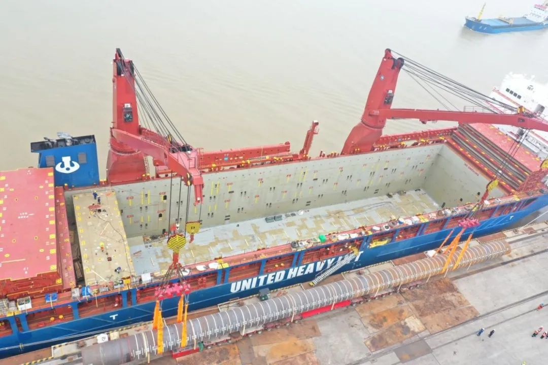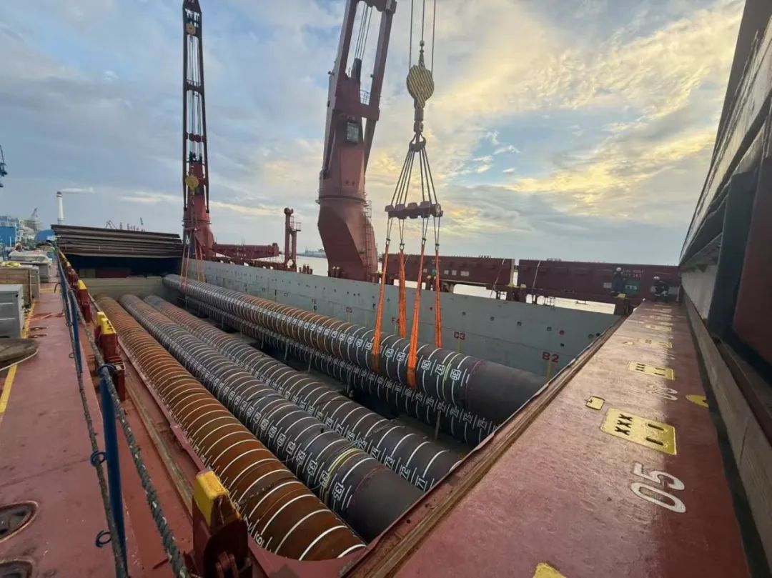 “幸福號”貨輪承載著江蘇天能海洋重工有限公司精心制造的尖端管樁裝備,這些“大國重器”將遠赴中東,為當地油氣資源開發提供關鍵基礎設施支持。全船共裝載45件管樁及配套鋼結構,其中管樁長度普遍超過40米,最長達76.8米,單件最大重量突破377噸,堪稱“海上鋼鐵巨龍”。