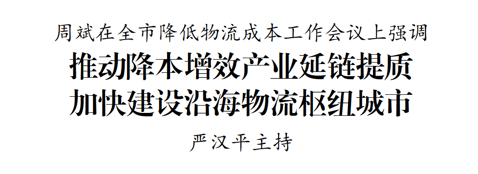 周斌在講話時深入分析了現(xiàn)代物流業(yè)發(fā)展的政策導(dǎo)向、當(dāng)前形勢和目標(biāo)任務(wù)。他指出,物流是實體經(jīng)濟的筋絡(luò),是支撐國民經(jīng)濟發(fā)展的先導(dǎo)性、戰(zhàn)略性、基礎(chǔ)性產(chǎn)業(yè)。全市上下要自覺從政治和全局高度認識,降低全社會物流成本是貫徹落實習(xí)近平總書記重要指示精神的實際行動,是著力破解高質(zhì)量發(fā)展新的“成長煩惱”的現(xiàn)實需要,是更好滿足人民對美好生活向往的務(wù)實舉措,切實增強工作的主動性和預(yù)見性,加快提升物流業(yè)規(guī)模、效率和效益,助力經(jīng)濟社會實現(xiàn)更高質(zhì)量發(fā)展。