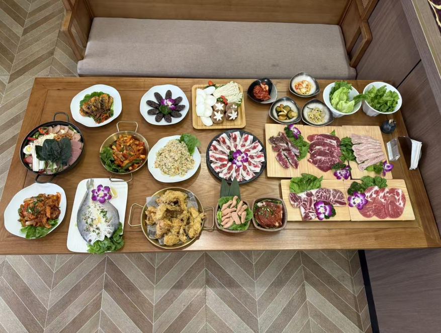 598元套餐(多人):牛五花、雪花牛板腱、LA 牛排、部隊火鍋、整只炸雞等韓式經(jīng)典,搭配南瓜湯、水果茶、生菜無限續(xù),聚餐氛圍熱烈。